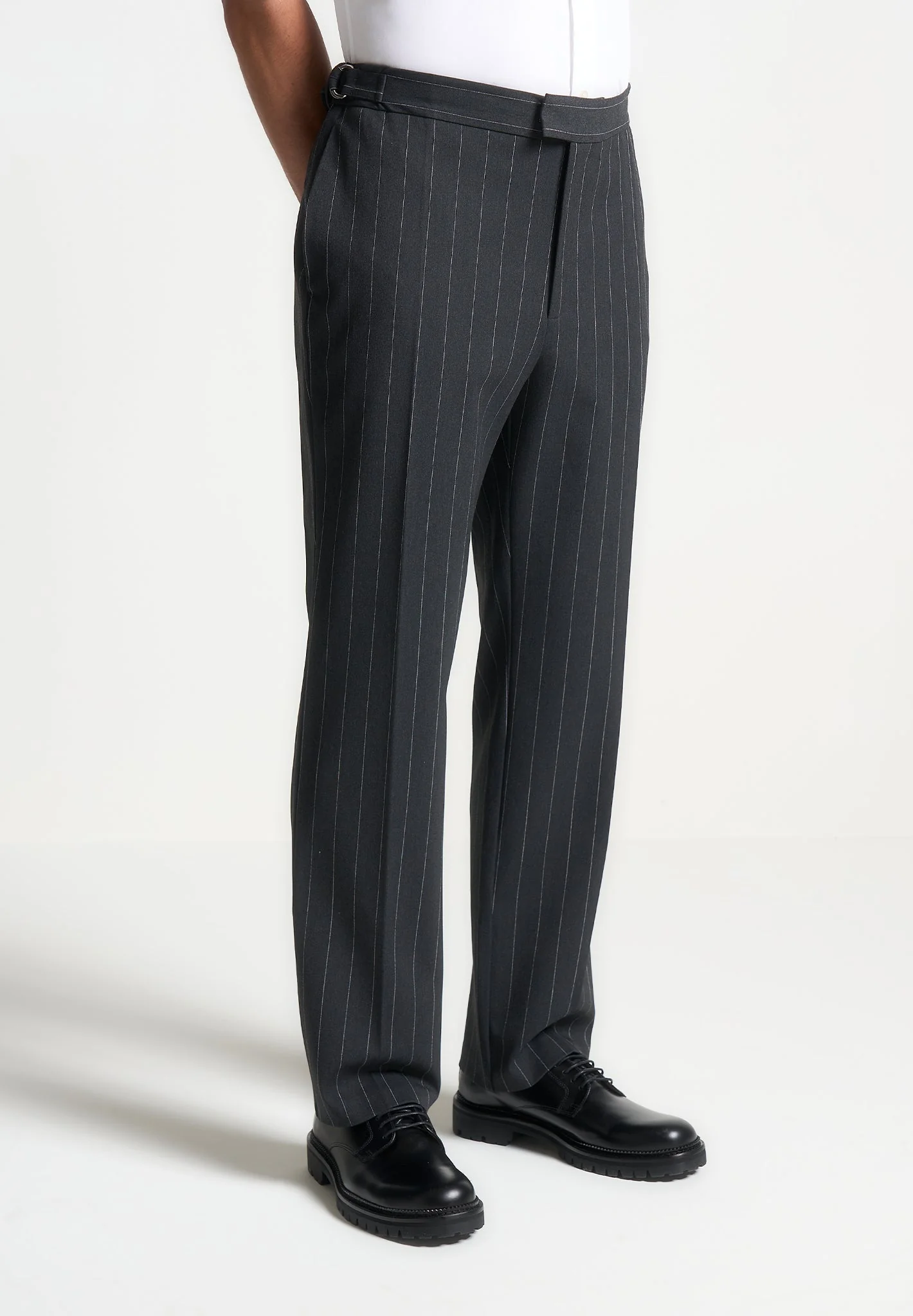 Elevate your wardrobe with the Regular Fit Pinstripe Tailored Trousers in Grey. Designed for a classic and comfortable fit, these Trousers feature a timeless pinstripe pattern that effortlessly complements any formal or smart-casual look. Pair with the Double Breasted Pinstripe Suit Jacket for a seamless look.